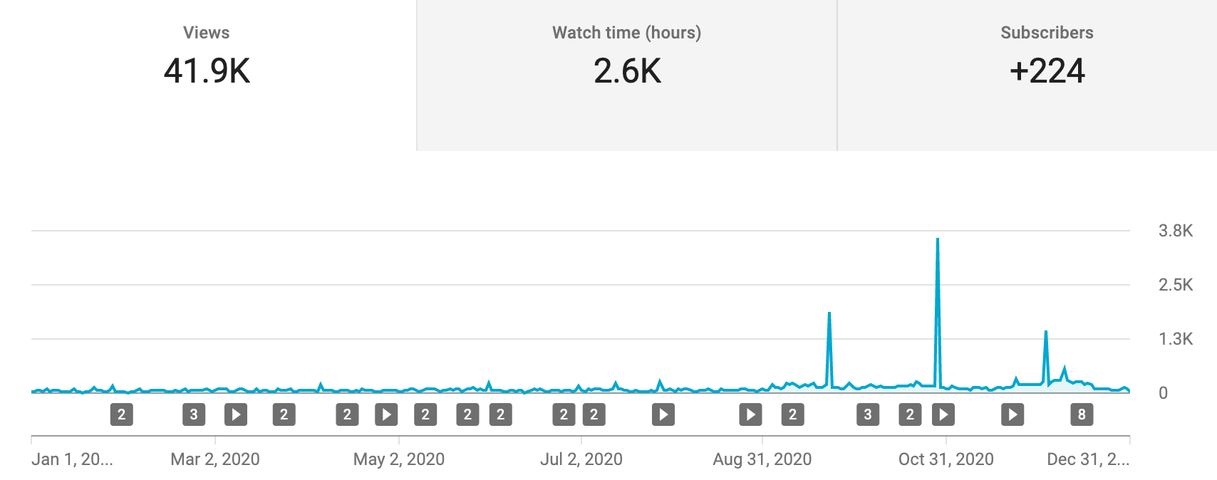 Throughout 2020 I continued to focus on creating content for my YouTube channel – which yielded more views, and an increase total watch time.