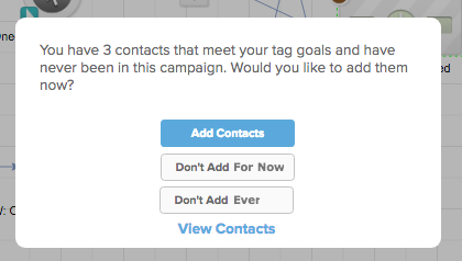 I love that tag goals can retroactively find contacts who would have been added to this campaign, and that you can choose whether or not you want to add them. So, well done, and thanks for that. But, it gets a little annoying for the campaign builder to ask me every single time I publish. Seems like maybe it’d work to give me a “dismiss” option so that it doesn’t ask again? Like so: