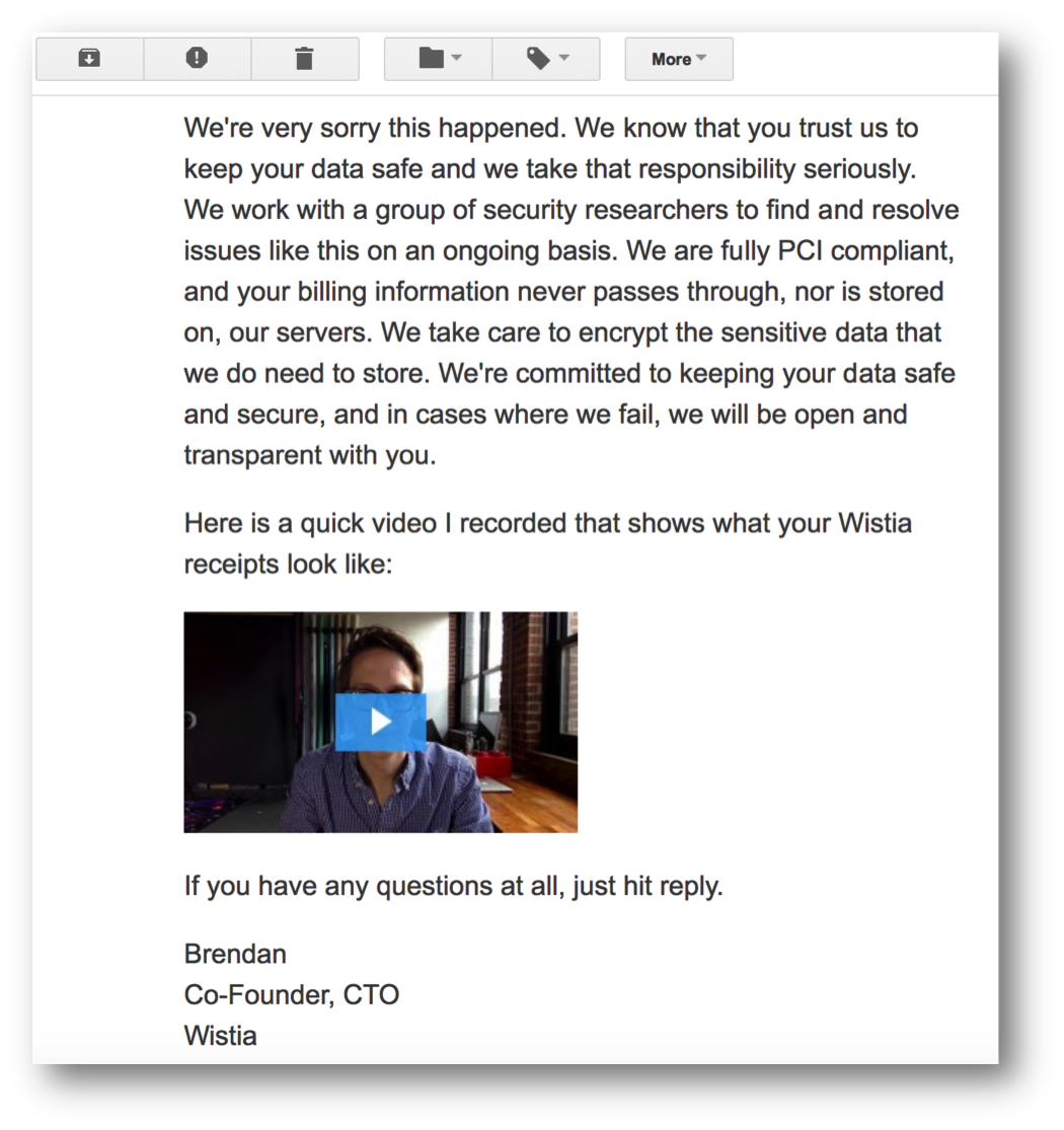 On June 13th I received an email from Brendan, the CTO at Wistia. Wistia is the video hosting service I use for all my videos, and for the past year they’ve been really solid. I recommend them pretty regularly. So, I get this email, and it’s an apology. It turns out that a customer had made them aware of a security vulnerability in their application that could allow a logged-in Wistia account owner to view other customers’ receipts or invoices.